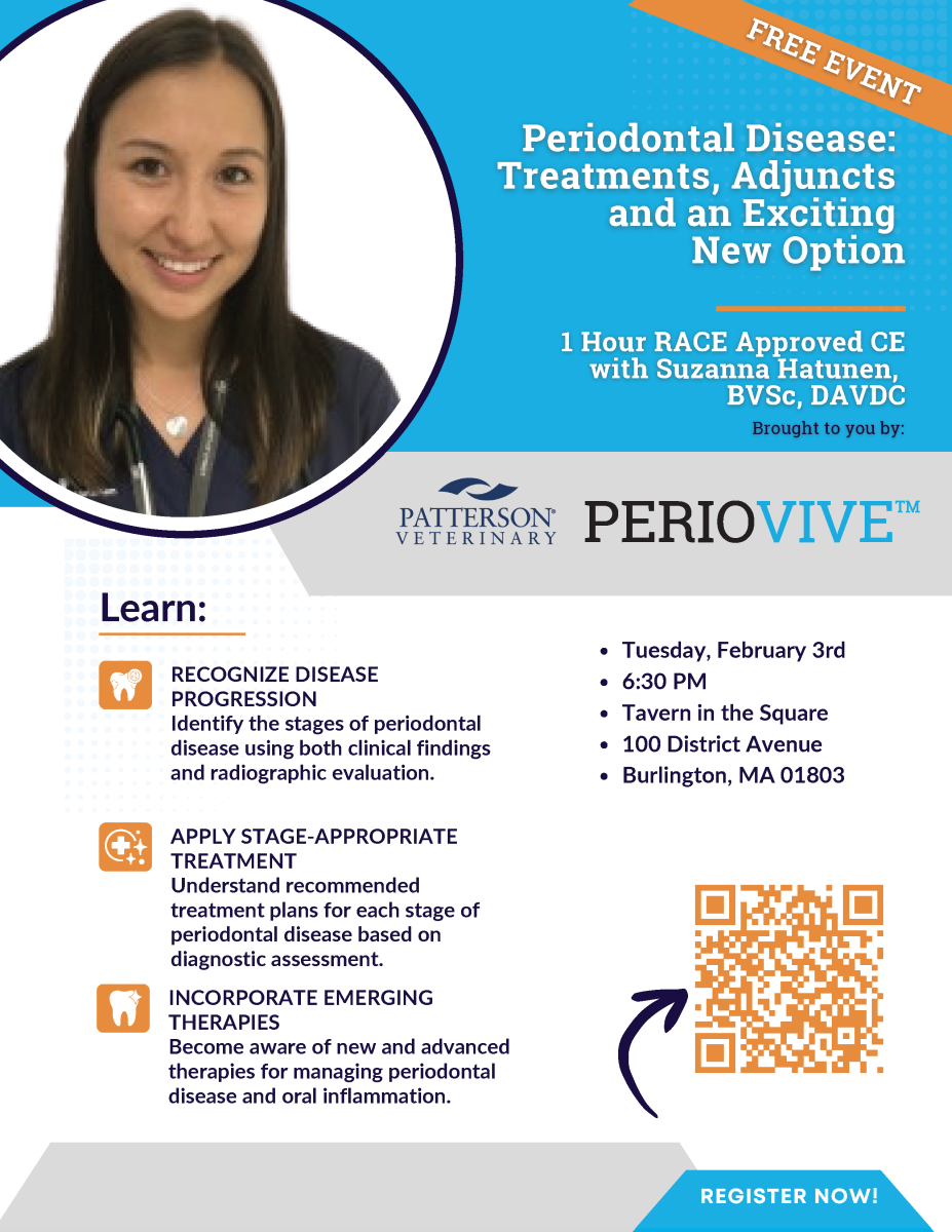 You’re invited to join us for a FREE, in-person CE dinner event in Burlington, MA, featuring an evening of education, great food, and engaging discussion with a nationally recognized, board-certified veterinary dentist.